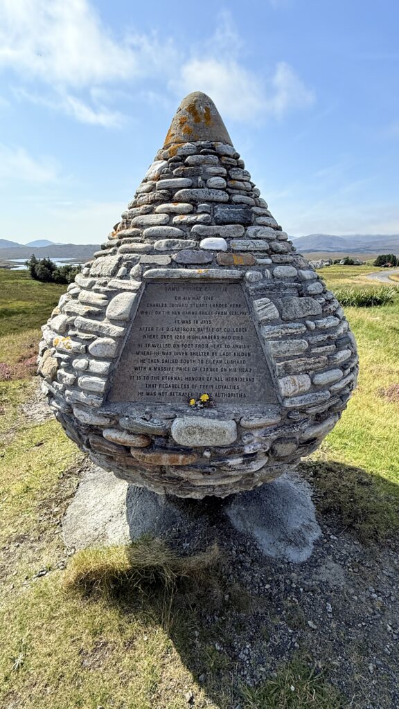 This is a memorial cairn commemorating Charles Edward Stuart (Bonnie Prince Charlie) and his escape after the Battle of Culloden (1746).