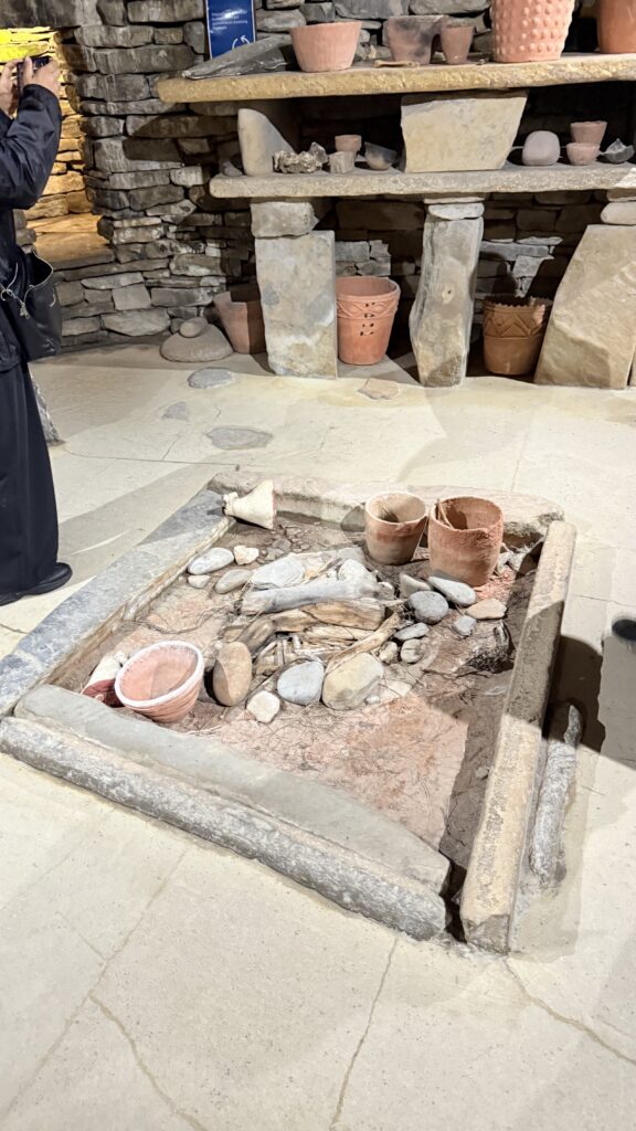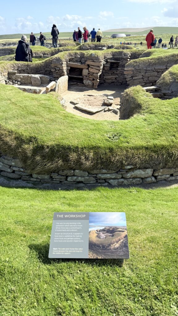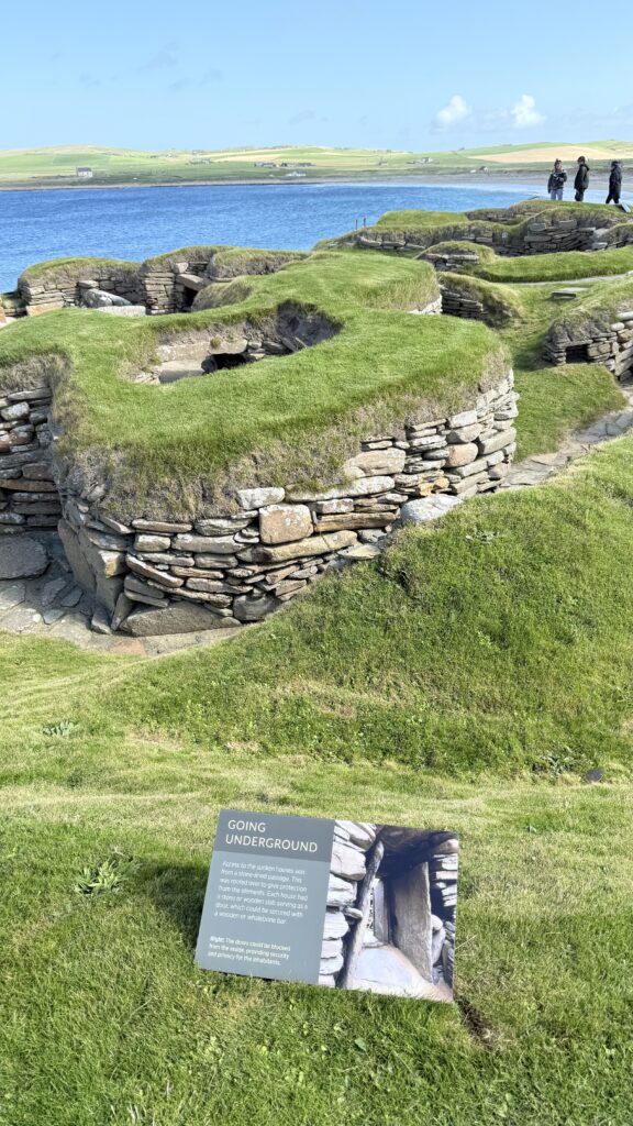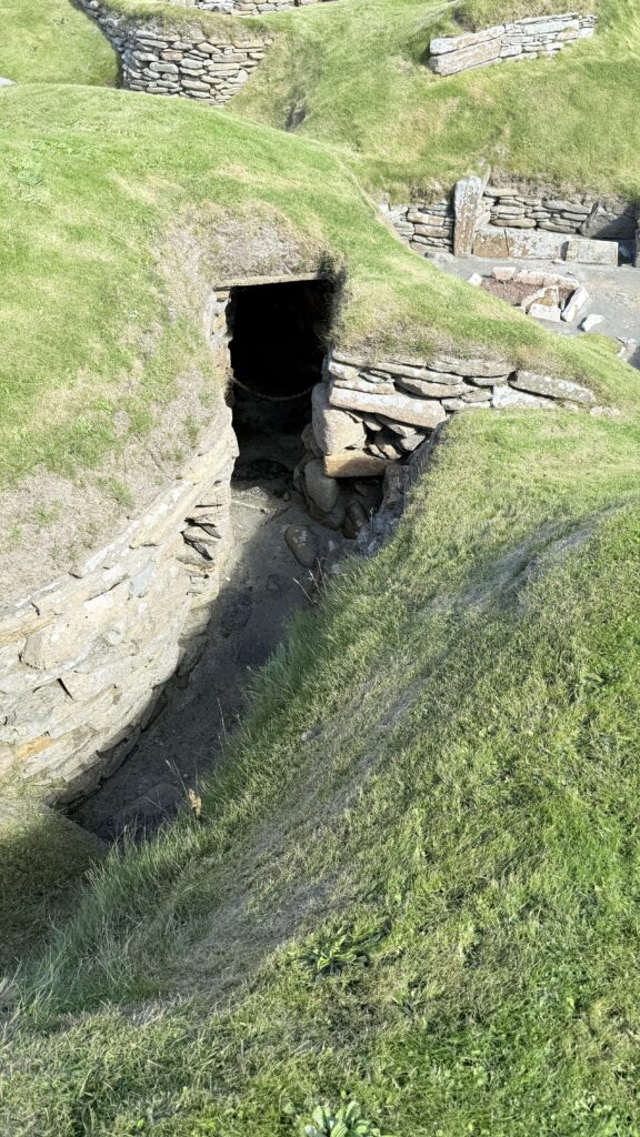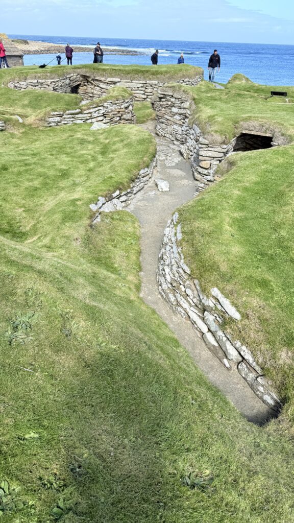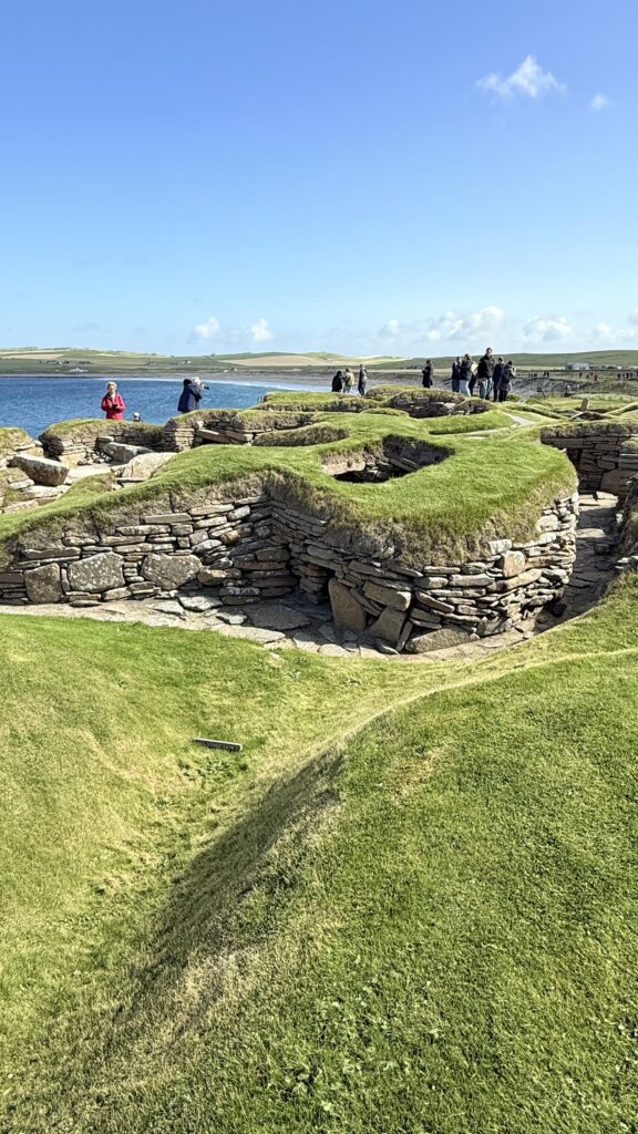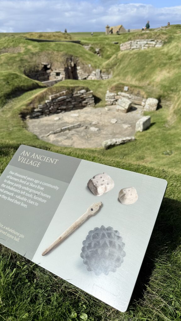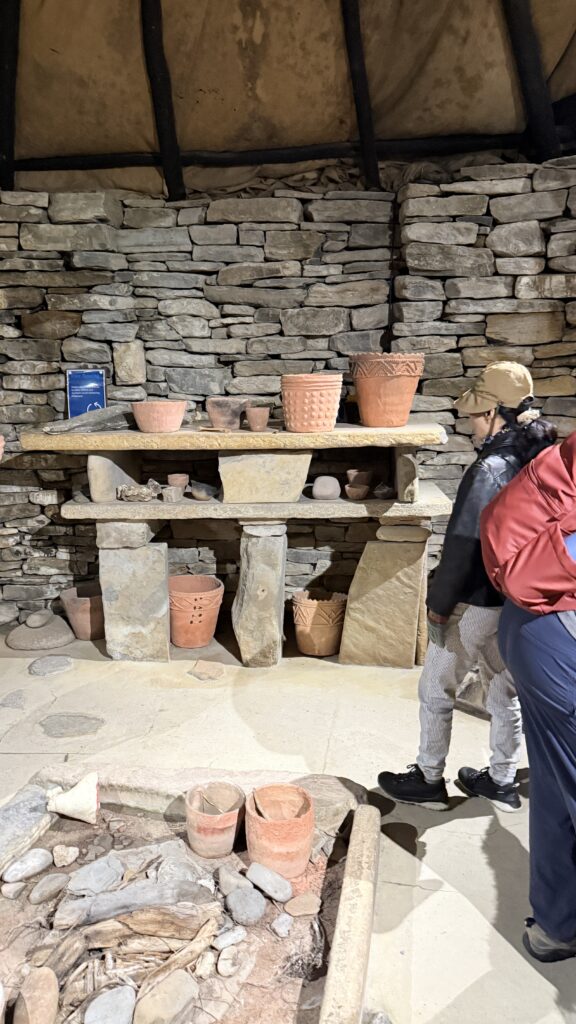 Skara Brae is a remarkably well-preserved Neolithic village, dating to around 3180–2500 BC. It consists of eight stone-built houses connected by covered passageways. Each home has stone furniture still in place, including beds, dressers, and storage boxes, showing how people lived over 5,000 years ago. The village was buried under sand for centuries, which helped protect it until a storm exposed it in 1850. Skara Brea predates the Egyptian Pyramids by centuries and is the oldest known village in Europe. We enjoyed our time here and even took a stroll on the beach