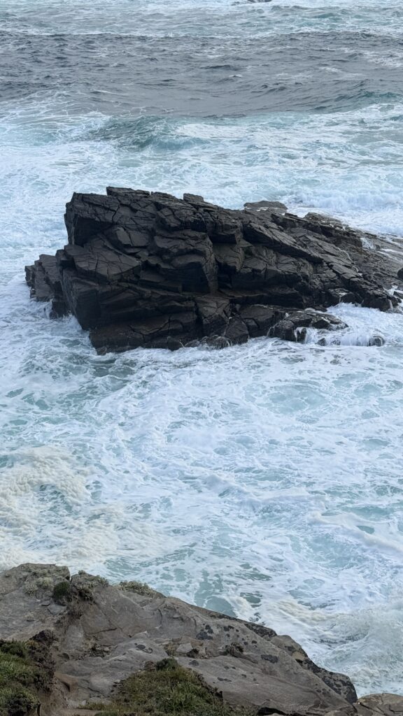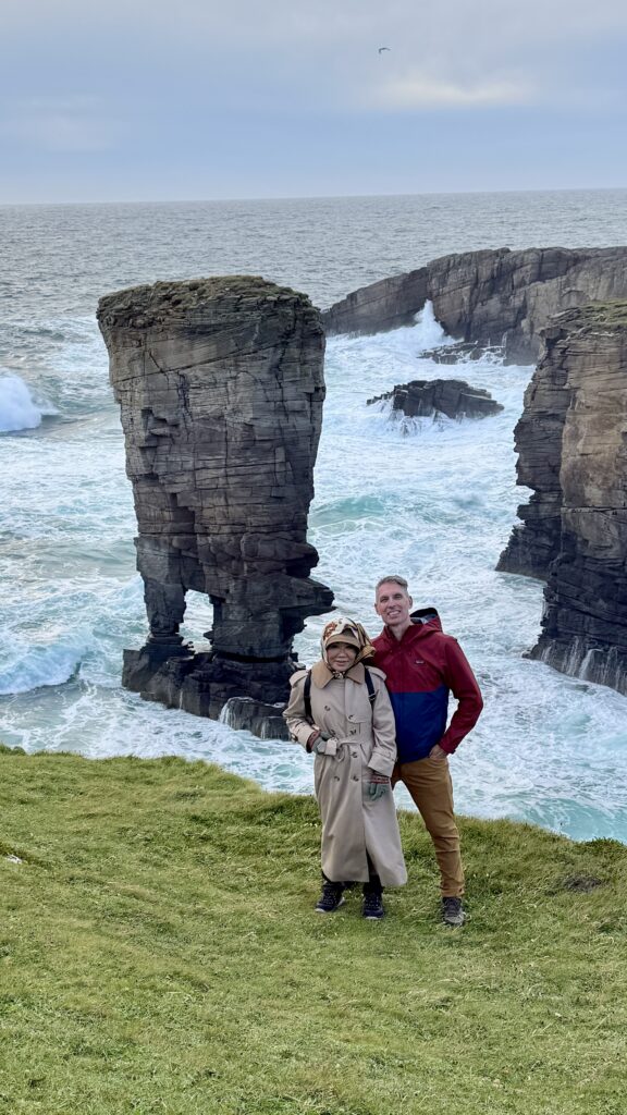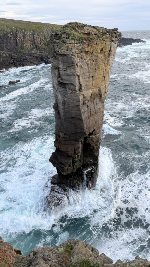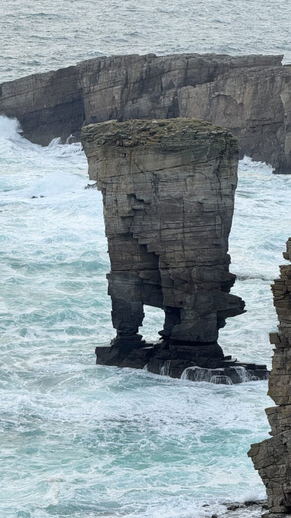 By far one of our favorite excursions is the stroll to Yesnaby Castle. You walk along the rugged cliffside with the sea pounding 40 meters below. Ocean spray is splashing everywhere and delicious looking sheep are wondering around. Yesnaby Castle is a dramatic sea stack on the west coast of Mainland Orkney, south of Skara Brae. It’s a tall, narrow column of layered sandstone separated from the cliffs by the sea, shaped over thousands of years by relentless Atlantic waves.