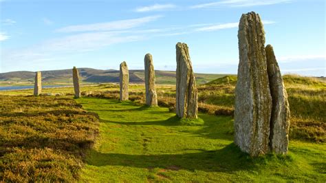 Orkney is a group of about 70 islands located 10 miles north of mainland Scotland across the Pentland Firth. Around 20 islands are inhabited. It is rich in history, with world-class Neolithic sites such as Skara Brae, Maeshowe, the Standing Stones of Stenness, and the Ring of Brodgar. Orkney was under Norwegian rule until 1472, and its Norse heritage is still visible in place names, traditions, and architecture. The landscape mixes rugged cliffs, sandy beaches, fertile farmland, and dramatic sea stacks like the Old Man of Hoy. Wildlife includes puffins, seals, whales, and large seabird colonies.