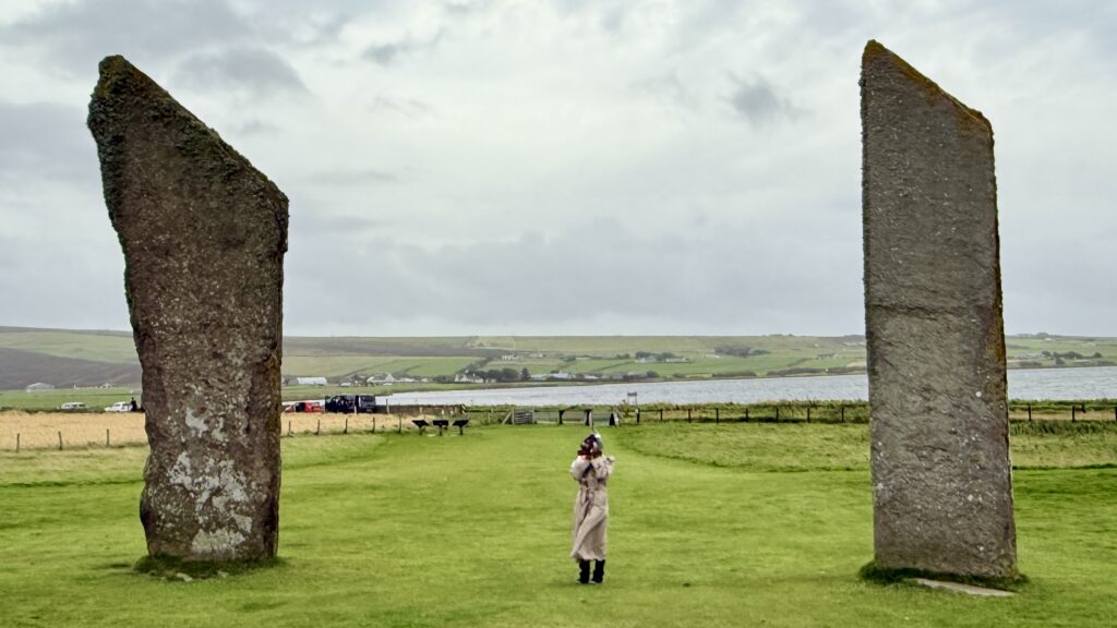 The Stones of Stenness are a Neolithic stone circle on Mainland Orkney, about 5,000 years old and among the earliest in Britain. The original monument had 12 massive stones set in an oval, but only 4 remain standing today, some up to 6 metres (20 feet) tall. Their exact purpose is unknown, though they were likely used for ceremonial or ritual gatherings, possibly linked to seasonal events or ancestor worship. The stones were nice but it was too windy and cold to spend much time.